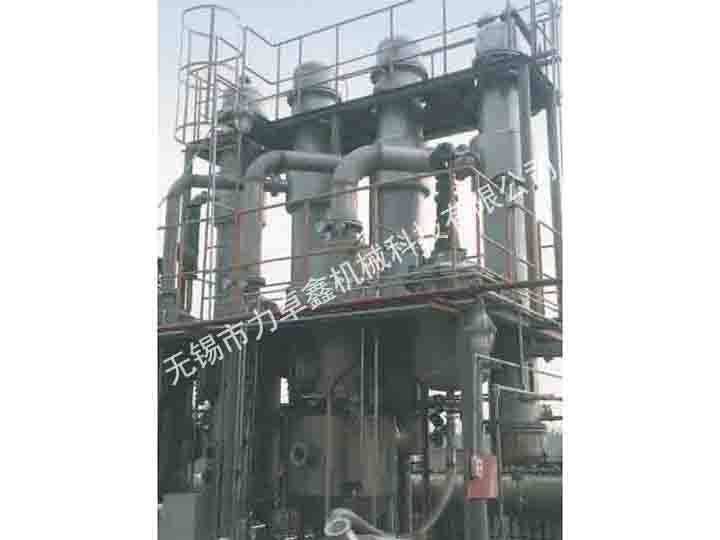 工作原理:四效降膜蒸發(fā)器需濃縮的料液由泵送入加熱管頂部,沿著加熱管內(nèi)壁形成液膜向下流動(dòng)。在這個(gè)過程中,由于管外的加熱,管內(nèi)液膜開始沸騰并部分蒸發(fā)